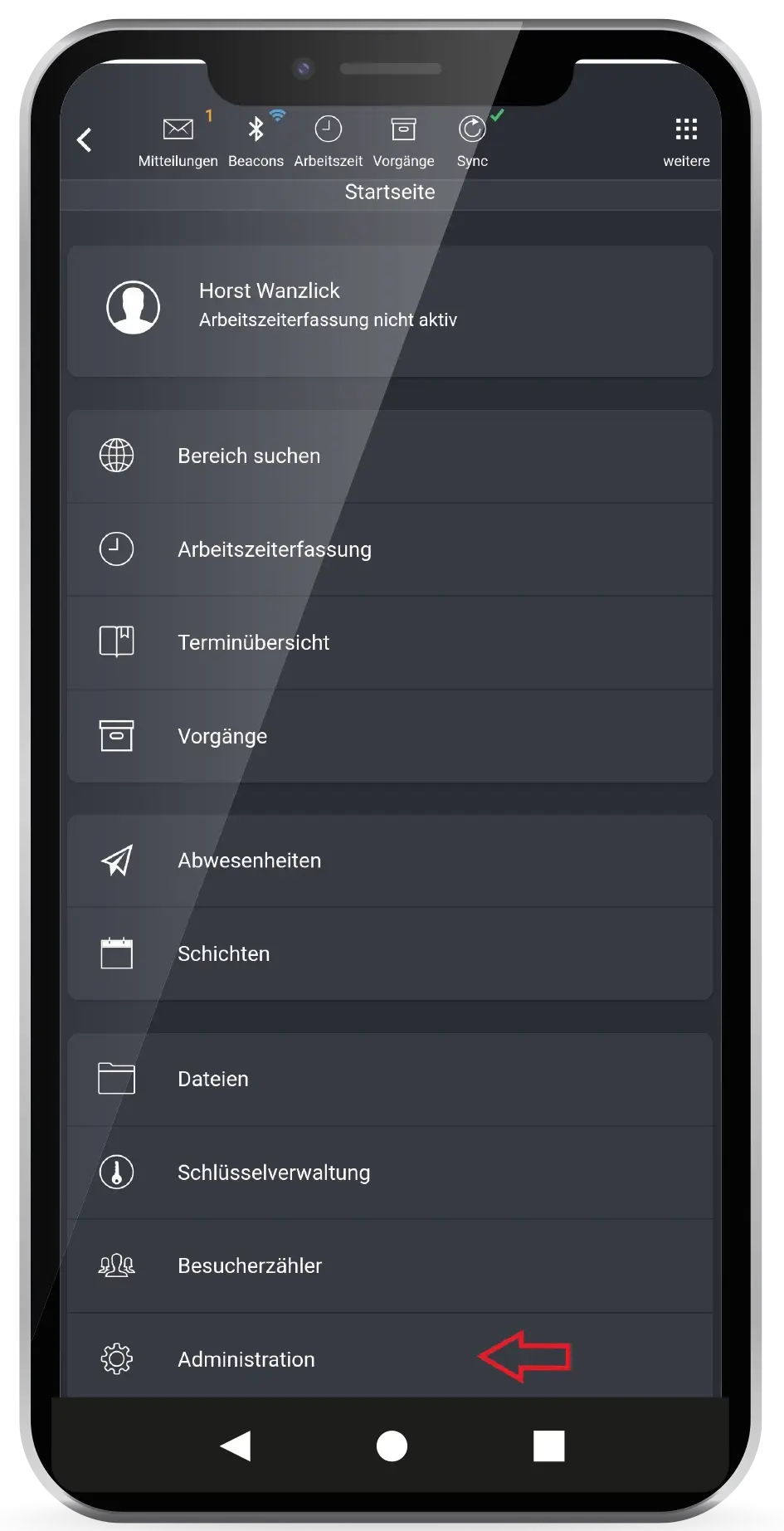 Loggen Sie sich bitte mit Administratorrechten an der App ein. Tippen Sie weiter unten auf den Punkt Administration.